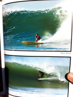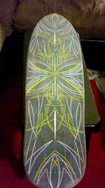 Case in point ~ see radical bottom turn pic to the left. This photo, circa 2005, is recently published in central coast chronicals. It was taken before his life changing accident. Prevented from surfing all boards he has been shreding with his pin striping art.